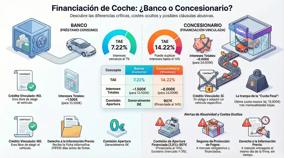 Hemos detectado que los créditos vinculados ofrecidos en concesionarios suelen tener una TAE que duplica la de un préstamo personal estándar, alcanzando cifras que superan los límites de la Ley de Usura. Además, es habitual encontrar comisiones de apertura elevadas (superiores al 3%) que, al estar financiadas, generan intereses adicionales durante toda la vida del préstamo, encareciendo el precio final de forma invisible.
