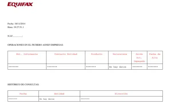 Ejemplo de informe de Asnef sin datos personales asociados al DNI del afectado.